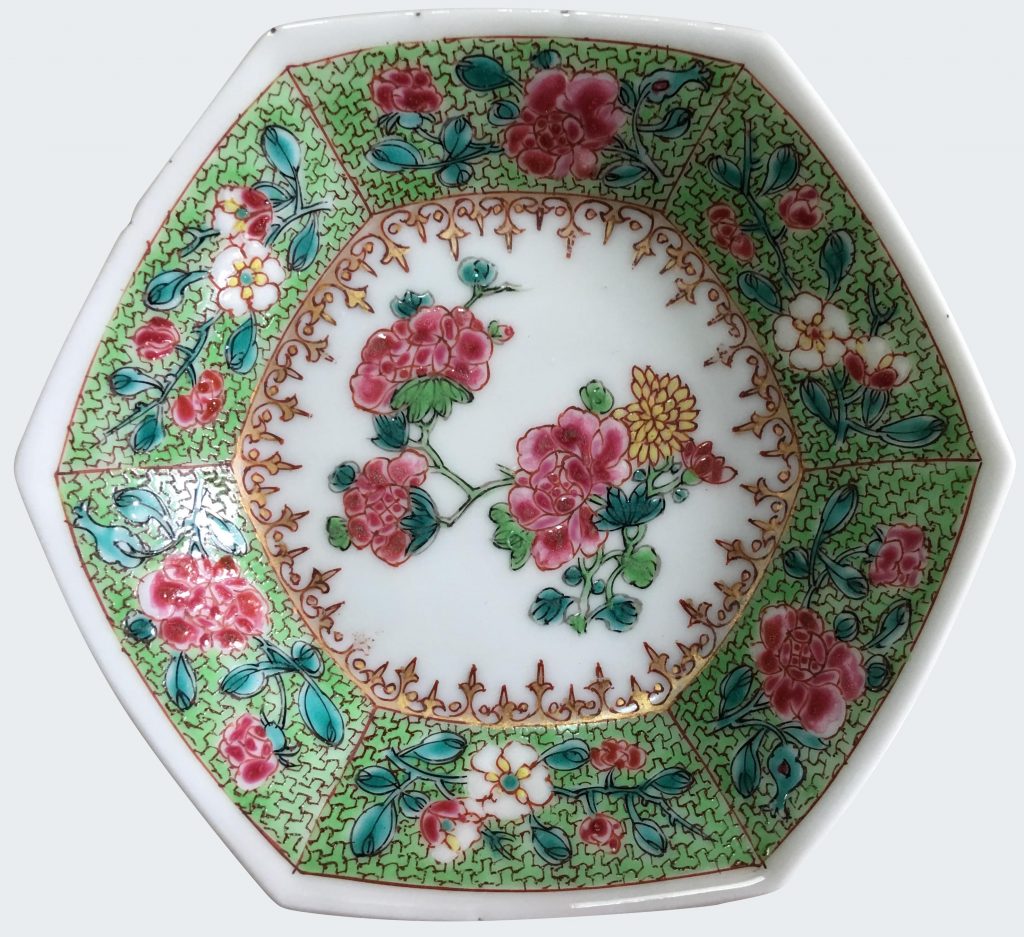 Painted in famille rose enamels, with a tobacco leaf at the centre and peonies on the rim.