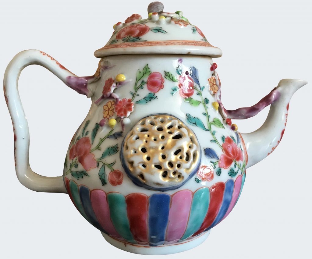 Teapot and cover moulded as a chrysanthemum, applied flower buds, leaves, and branches, decorated in famille rose enamels with palette in riche pink enamels.