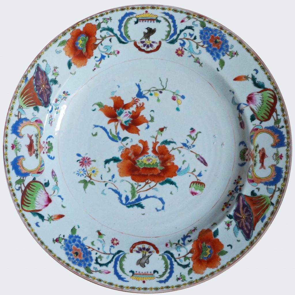A Chinese plate from the “Serviço dos Pavões” in famille rose enamels. Qianlong period.