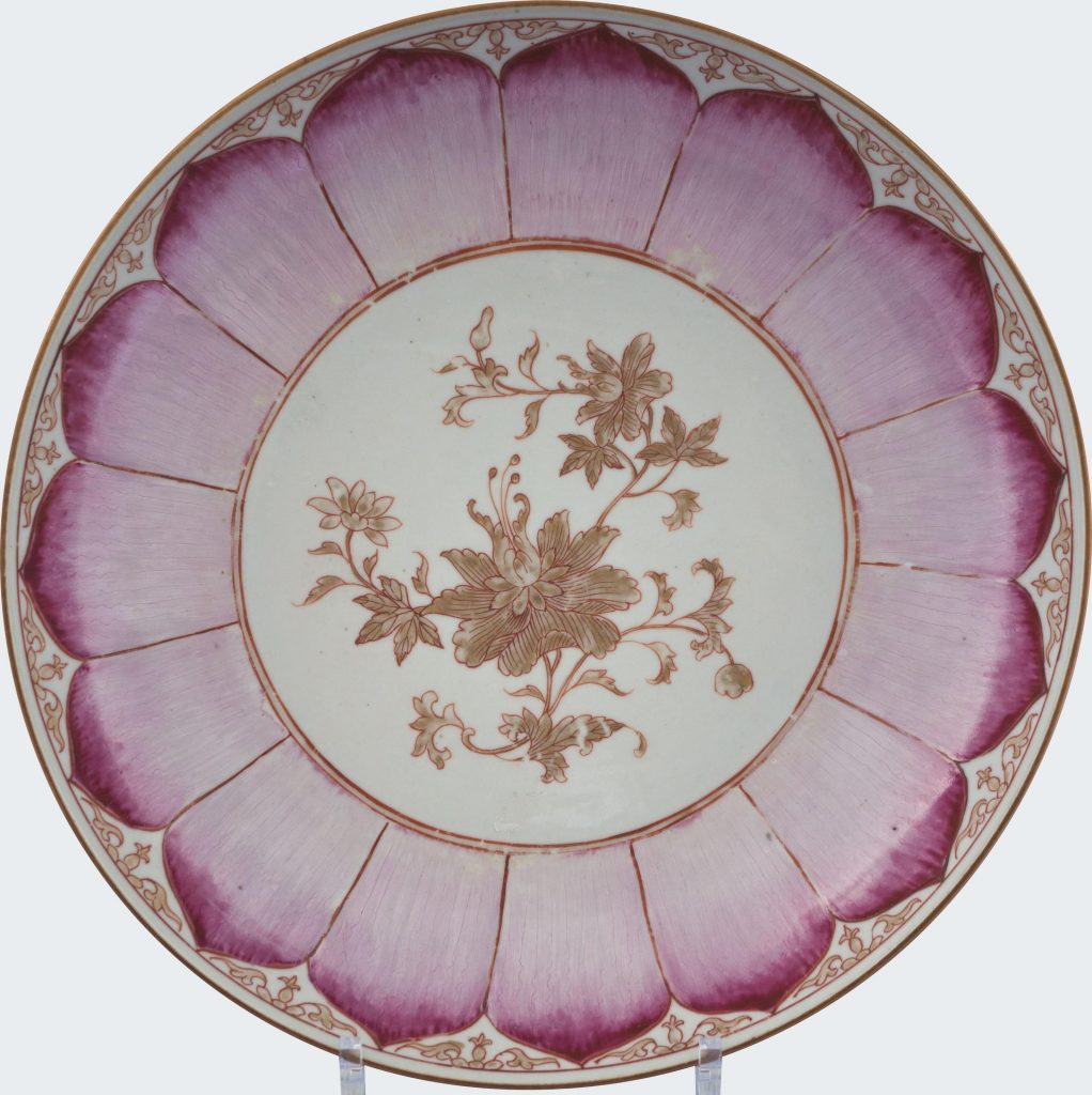 Decorated famille rose enamels, with ruby-pink and gold, with narrow band and stylized leaf springs at the rim, hibiscus spray within a central roundel encircled by radiating lotus petals.