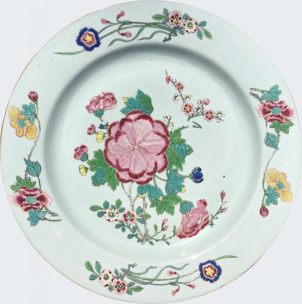 Enameled in the Chinese taste in opaque enamels of the famille rose (Fencai) palette in natural colors, the center with branches of camellia and prunus, anemone, peonies and bindweed sprays on the rim ; the reverse with the Chenghua mark.