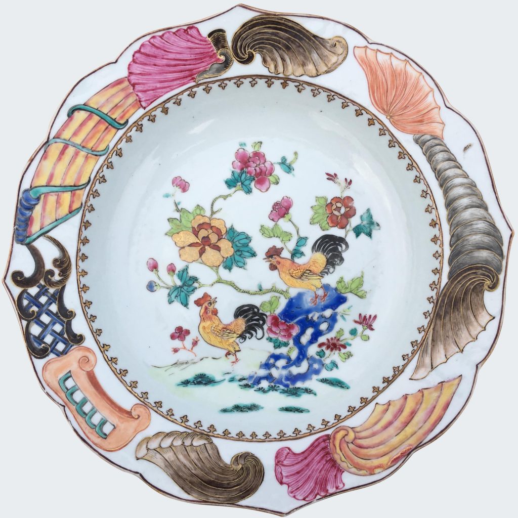 Enameled as the centre with two cockerels, one perched on blue pierced rockwork beside three peonies, within a band of gilt spearheads in the well and a bold and stricking design of shells at the border below the foliate rim.