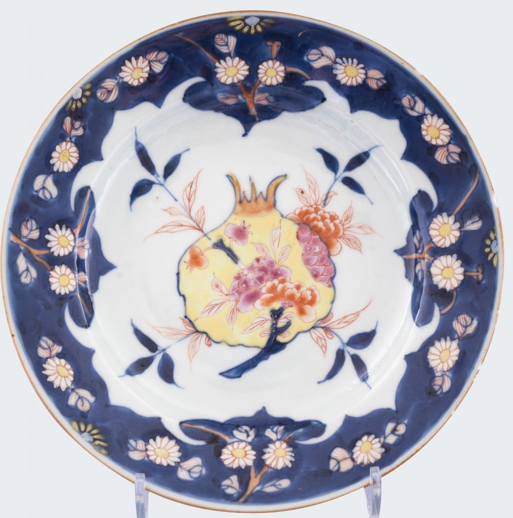 Decorated in a combination of dark underglazed blue with pink, orange and yellow enamels. The central motif, a pomegranate, amongst flowers and foliage, has burst and shows its seeds. The decoration of the rim, with chrysanthemums, drawing four ruyi.