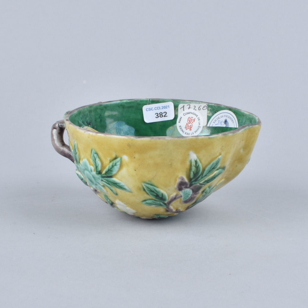 In the form of an oval bowl with slightly tapering sides and a broad pouring lip. The rectangular handle is supported by two chilong dragons applied one on either side and another two dragons are applied under the lip. The cup is covered with a very thin layer of transparent glaze and painted with famille […]