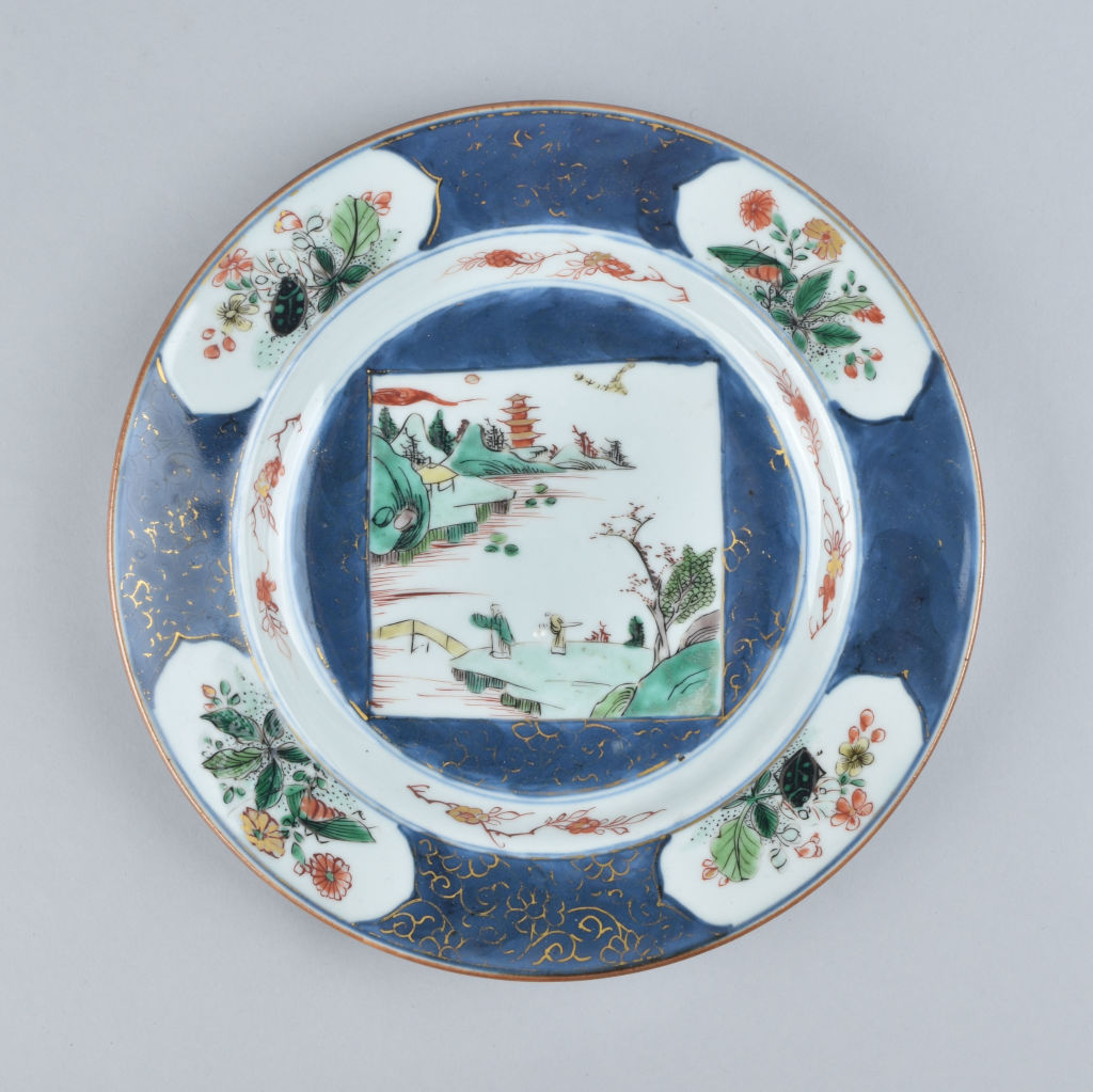 Each reserved with a square panel enclosing two figures in a landscape and insect cartouches at the border, the blue ground with traces of gilt decoration