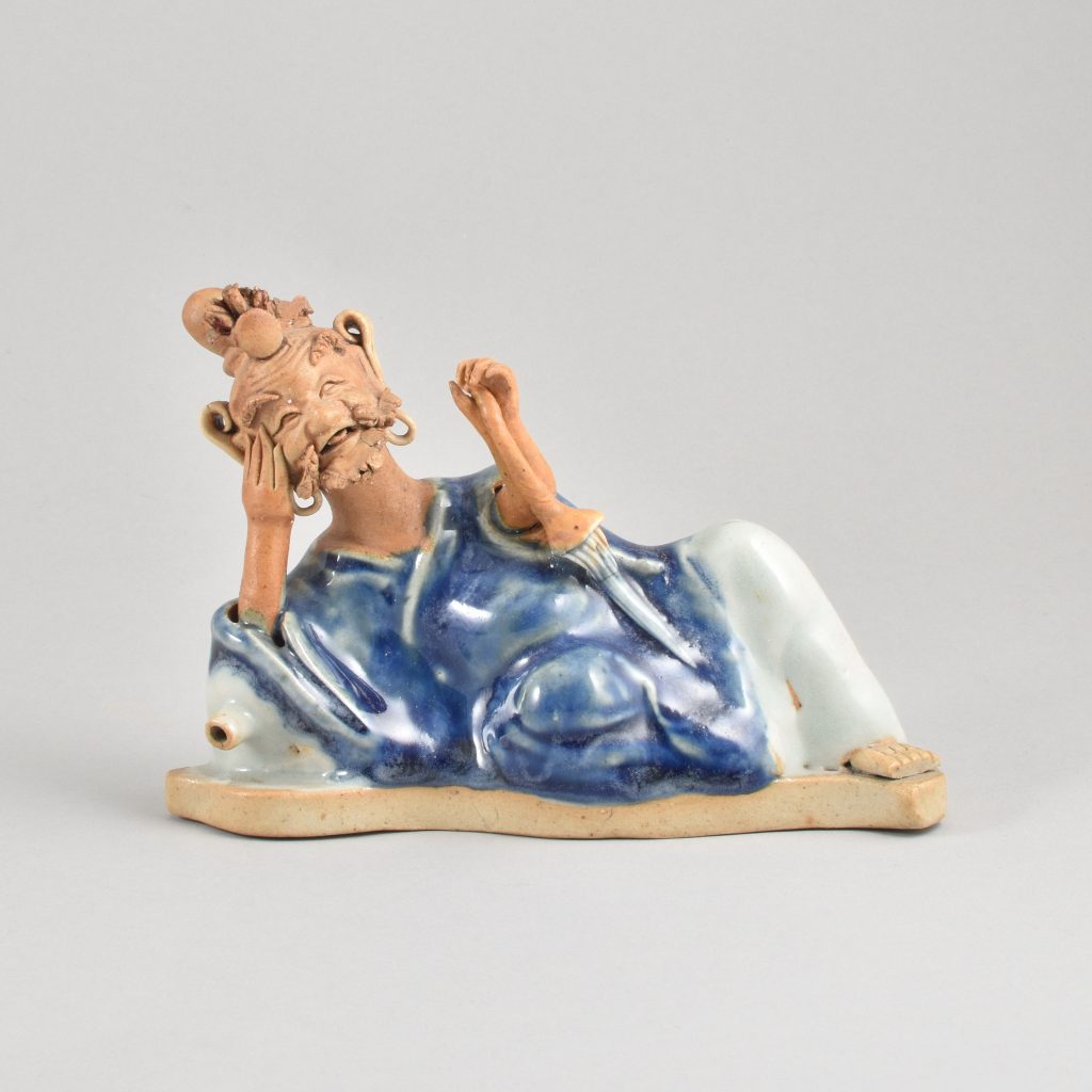 Naturalistically modeled depicting the poet Li bai, lying down, his arm resting on a wine jar, his head supported by his hand, his figure clad in a glossy blue robe and loose white thousers.