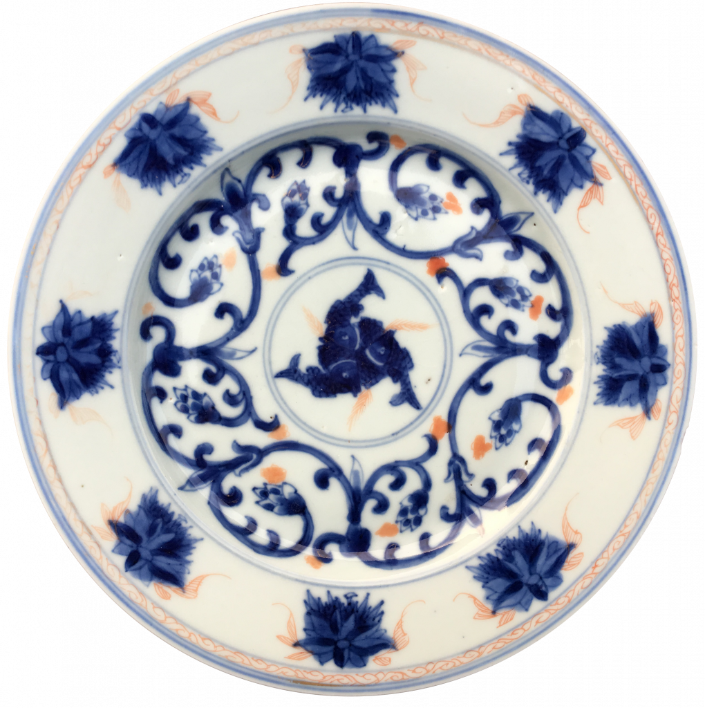 A Chinese imari plate decorated with three carps. Kangxi period.