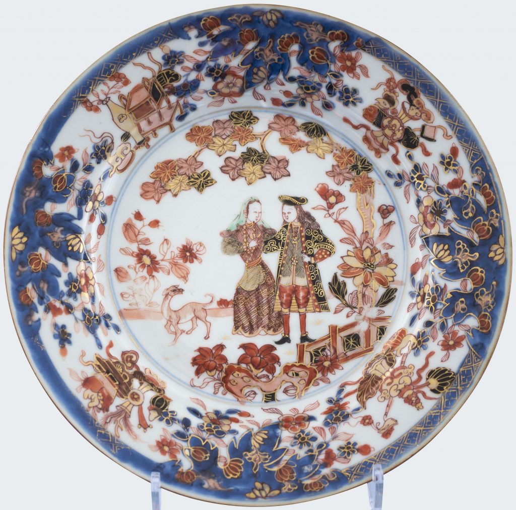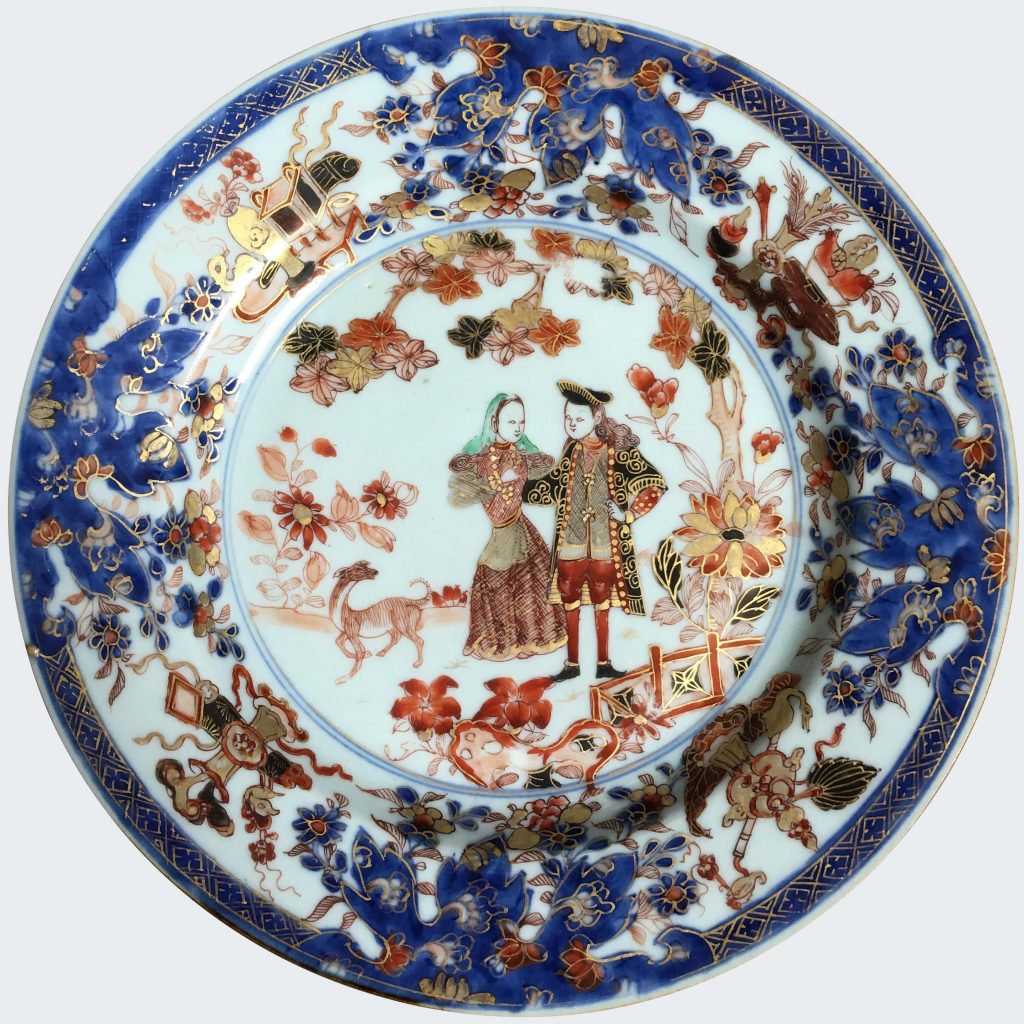 Finely decorated in the traditional imari palette, the centre with a European couple, traditionnaly thought to be Governor Duff and his wife, standing on a garden terrace beside a hound, within an elaborate floral border with four clusters of the Hundred Antiques.