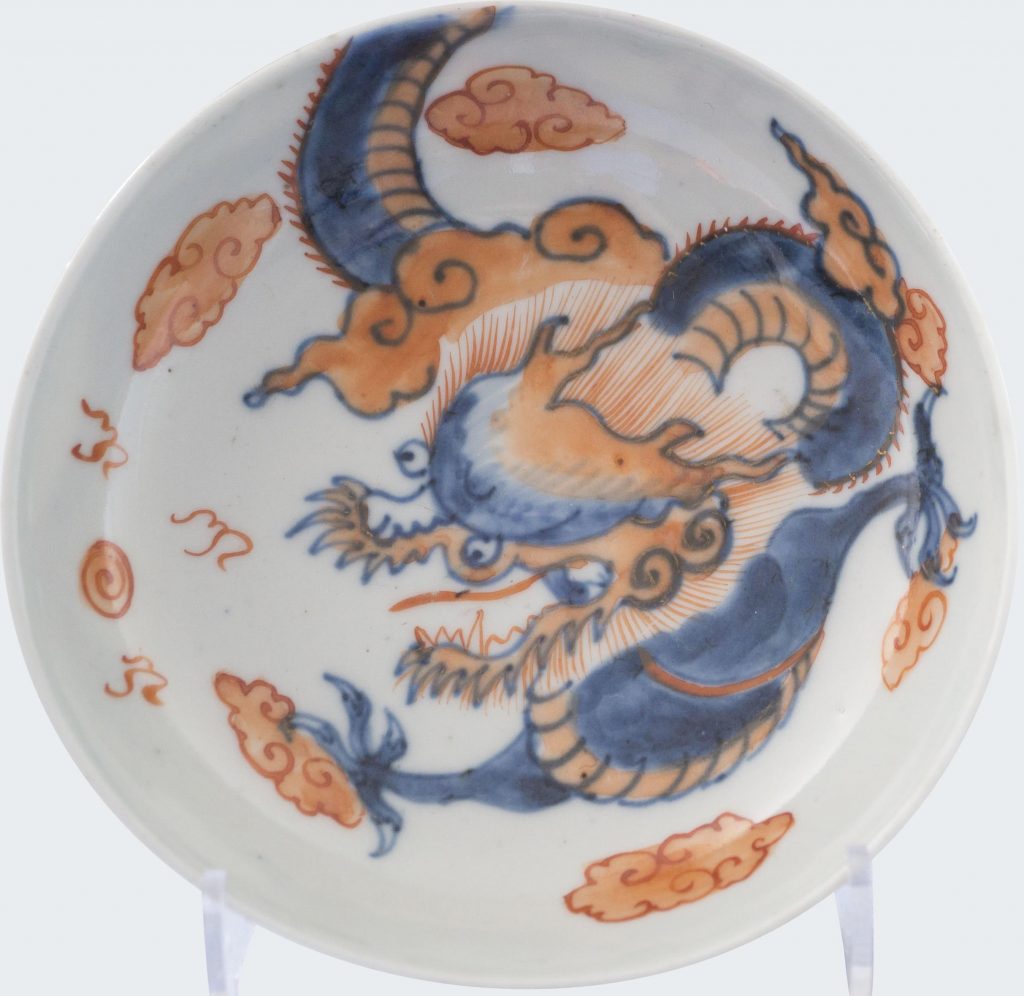 Tea bowl and saucer painted in iron red underglazed blue with the so called four-clawed dragon pattern, depicting a coiled beast pursuing a flaming pearl amongst clouds with its tail curling over the rim. This model was copied by the manufacture of Worcester.
