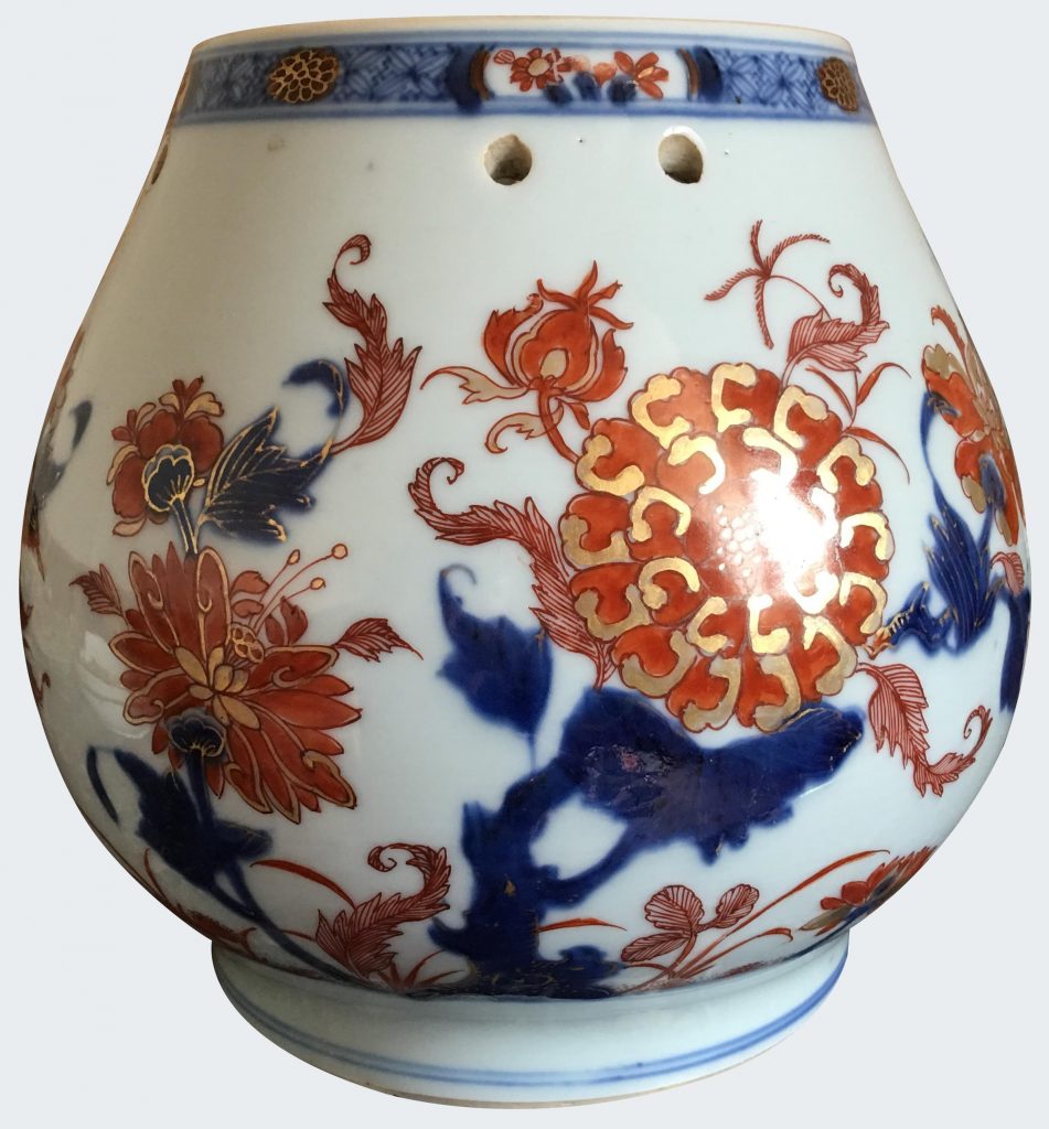 Oviform vase with short cylindrical neck, decorated in iron red and gilt on underglaze blue, with broad band of plum, chrysanthemum and hydrangea issuing from rockwork, the shoulder with a band of chrysanthemum petals with various geometrical and floral designs, the neck with karakusa, the domed cover similarly decorated, the finial modeled as sacred pearl.