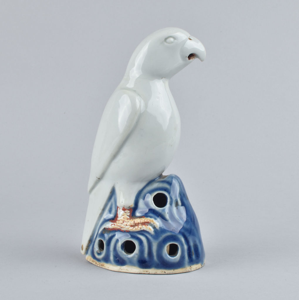 A biscuit figure of a parrot, naturalistically moulded in two halves, perched on a pierced rock work base and with folded wings. Its head is turned slightly to the left and the beak is open. The body kept white, traces of vermillon can be seen of the beak, eyes, and claws. The hollow rock-work base […]