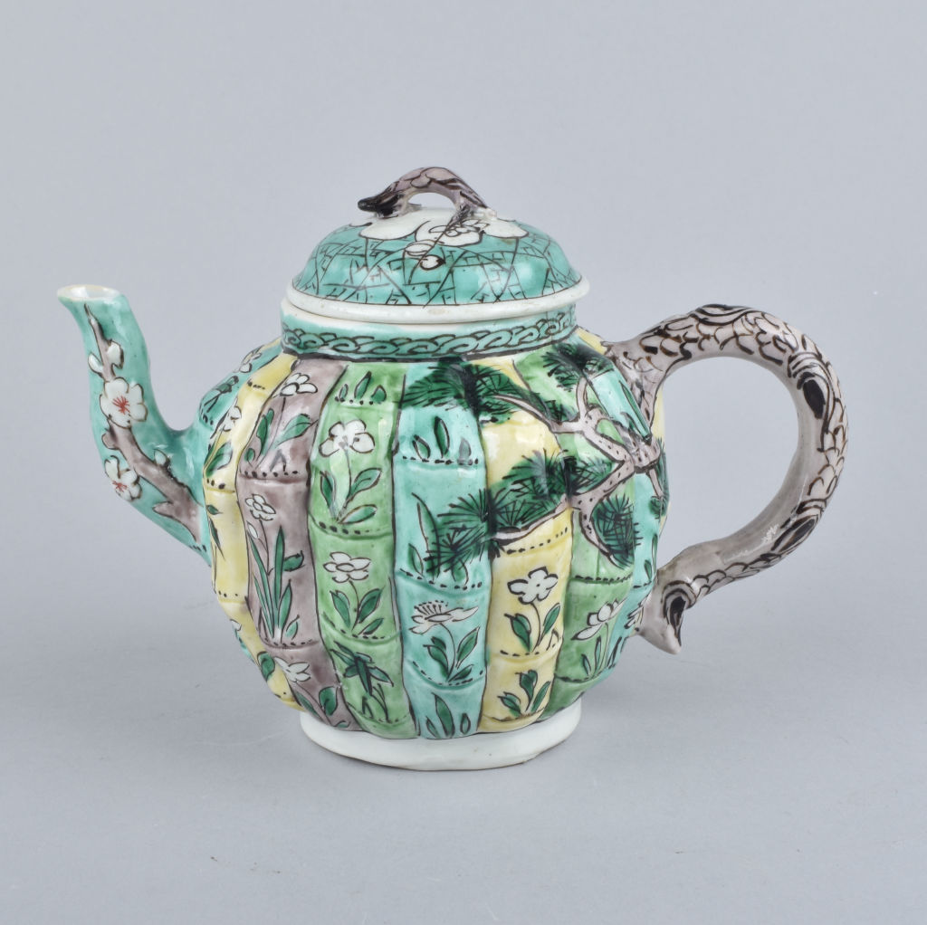 In the form of an oval bowl with slightly tapering sides and a broad pouring lip. The rectangular handle is supported by two chilong dragons applied one on either side and another two dragons are applied under the lip. The cup is covered with a very thin layer of transparent glaze and painted with famille […]