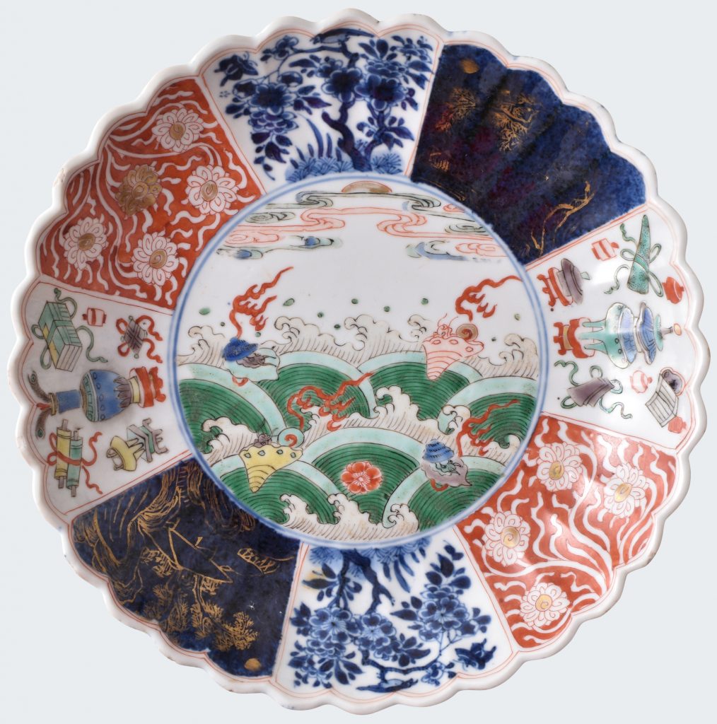 Decorated at the centre with mythical sea creatures amongst fire-scrolls and turbulent waves beneath panels of precious emblems, riverscapes and flowers-sprays in the fluted well.