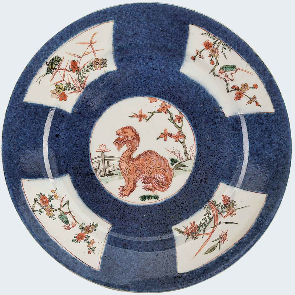 A Chinese powder blue plate decorated with a chimera. Kangxi period