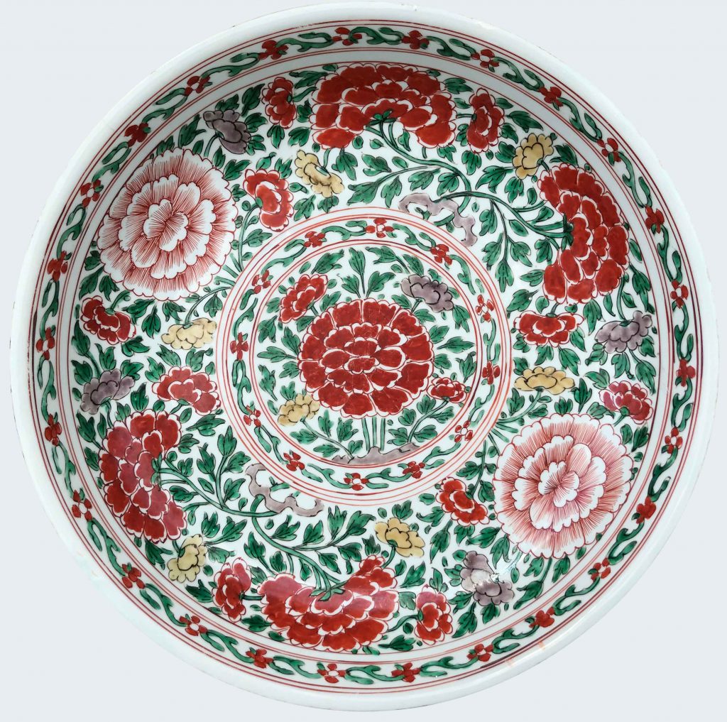 Decorated in the famille verte palette, with a central medallion and branches of peonies and chrysanthemum.