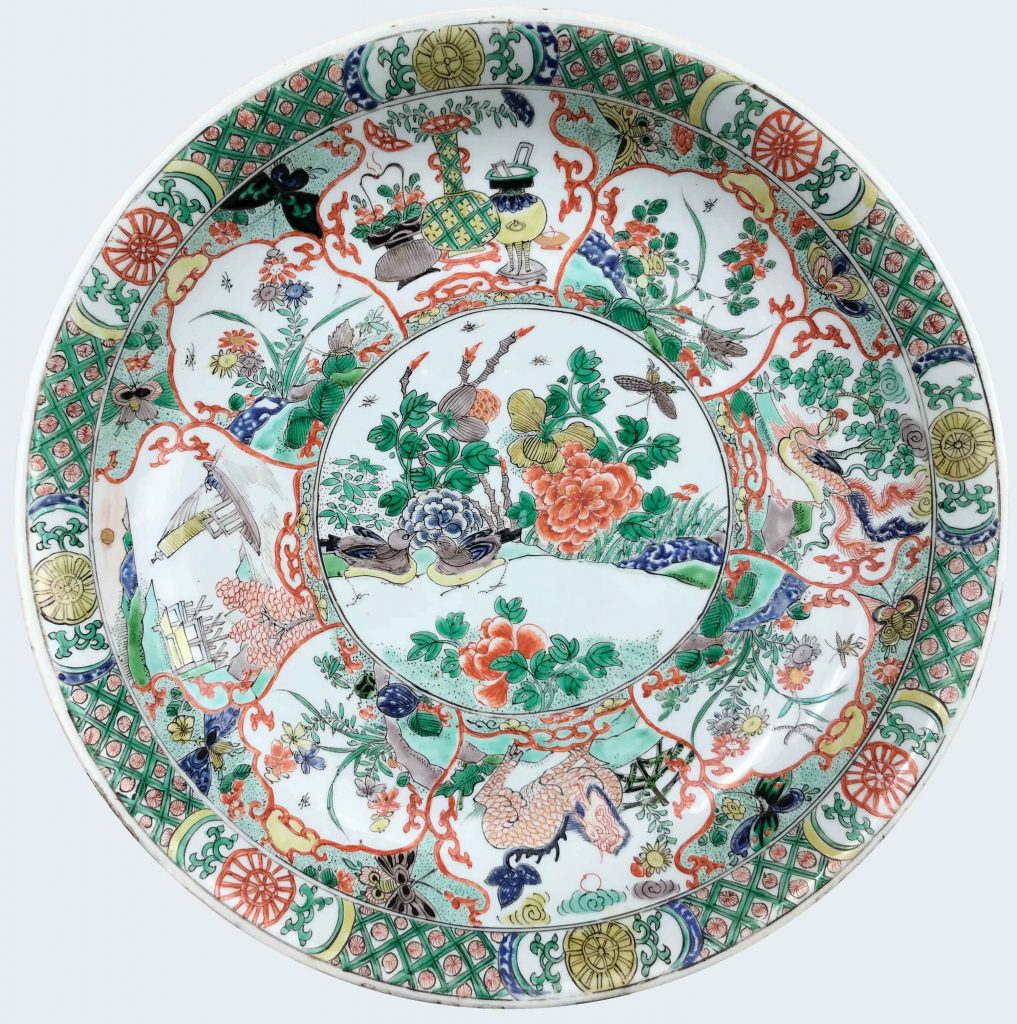 A very large Chinese famille verte dish decorated with mythological animals and landscape. Kangxi period.