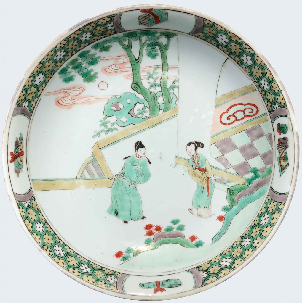 A large Chinese famille verte dish decorated with a romance. Kangxi period.