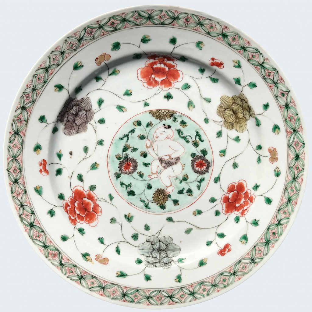 Decorated in the famille verte enamels, to the central roundel with a boy, surrounded by a flowering scrolls at the well.