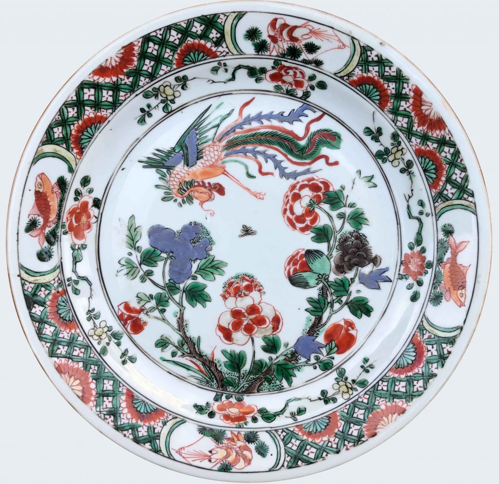 A Chinese famille verte plate from a pair decorated with a fenghuang. Kangxi period.