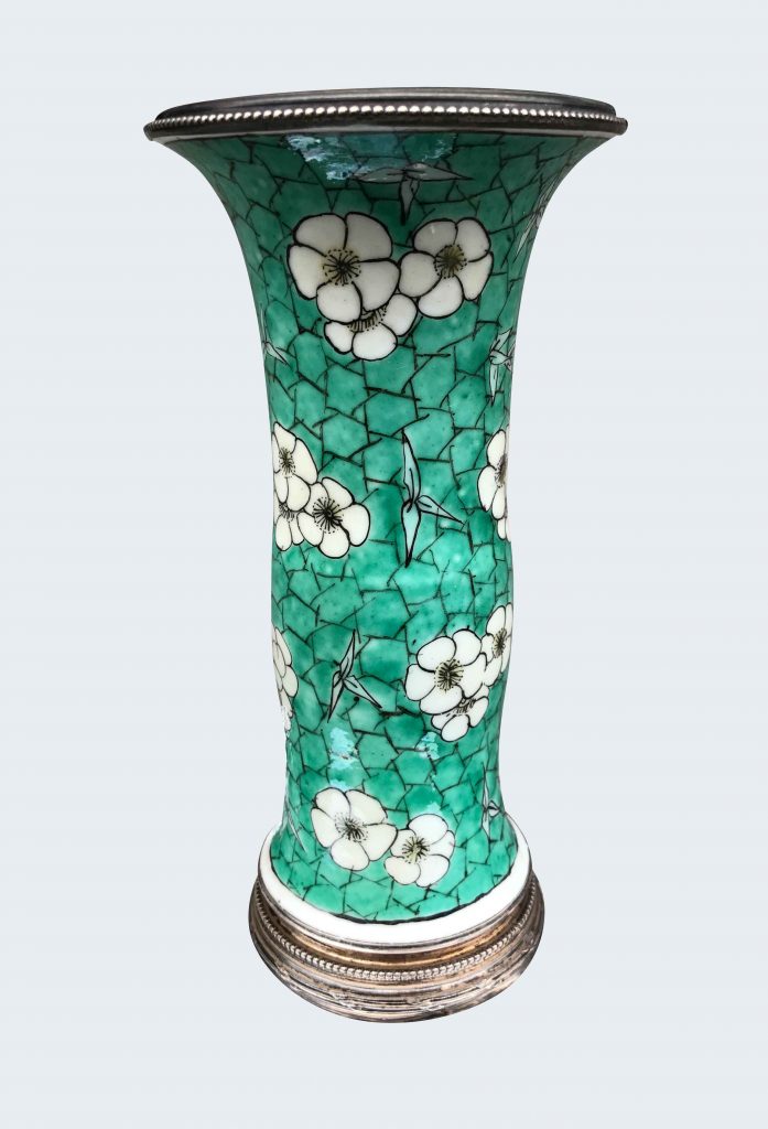 Decorated in famille verte enamels, with an ice-ground and flowers of chrysanthemum. Silver French mounts.