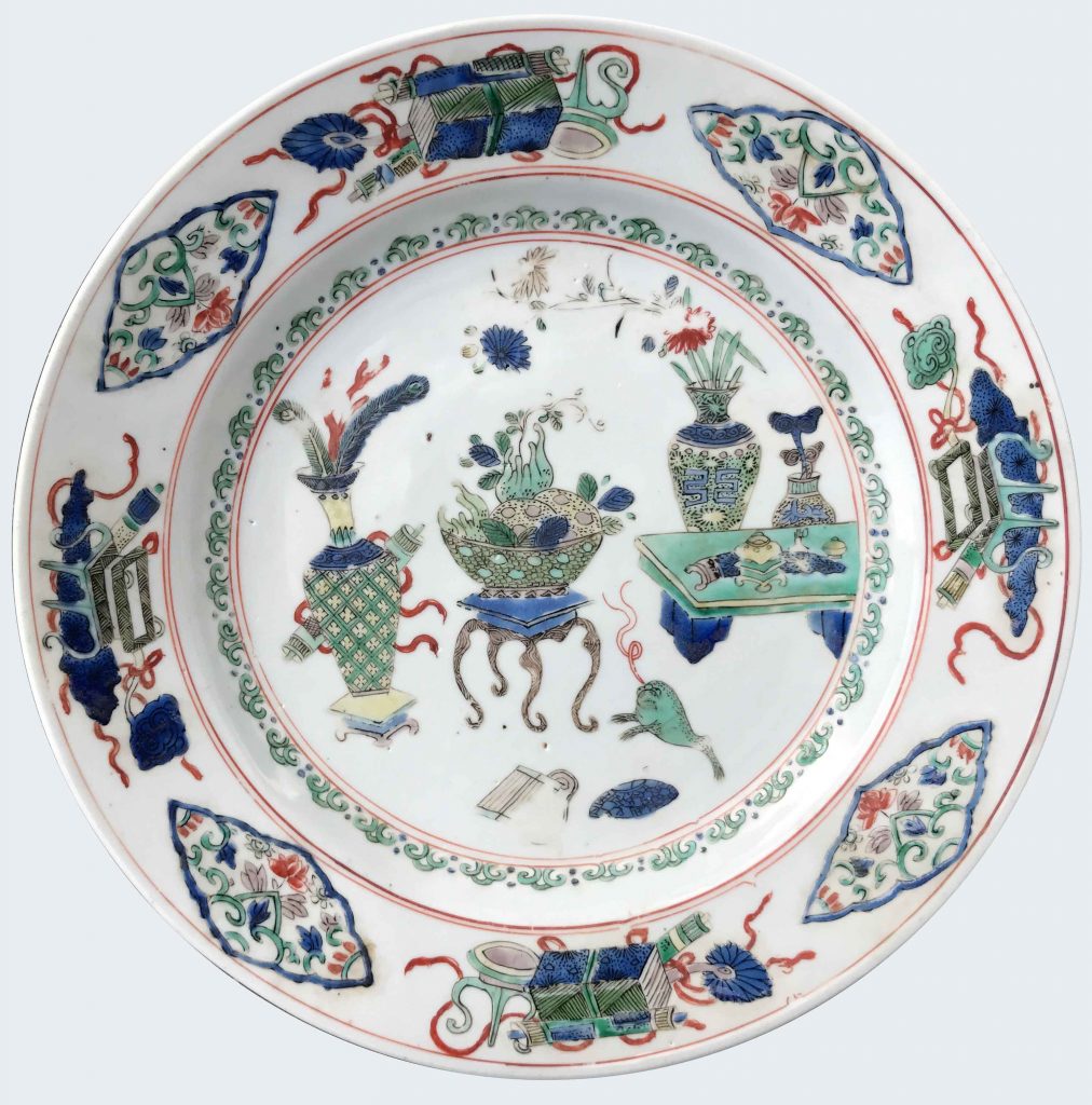 A Chinese famille verte plate decorated with buddhist attributes. Kangxi period.