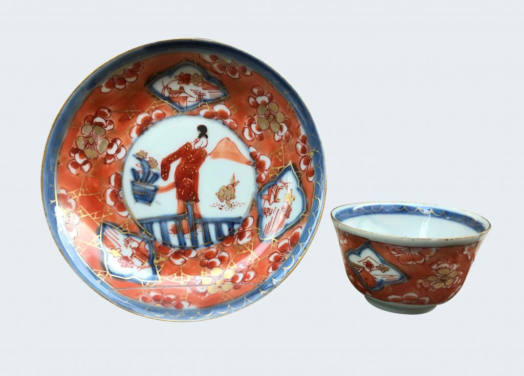 A Chinese cup and saucer decorated with a Chinese lady and a rabbit. Kangxi period.