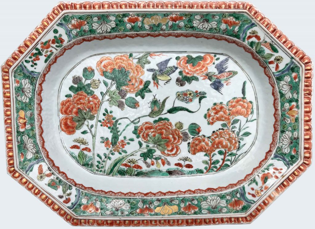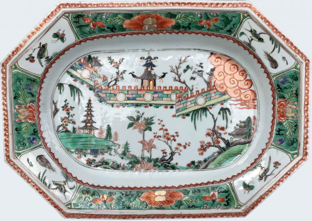 Of canted rectangular form, brightly painted in the centre with pagodas, pavilions and a zigzag wall in a setting with willows and pines, representing probably the Great Wall of China, the rim with vignettes of birds on a seeded green ground, the pie-crust rim in iron-red and gilding.
