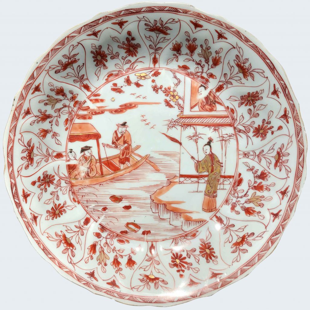 A Chinese Blood & milk dish depicting Chinese life. Kangxi period.