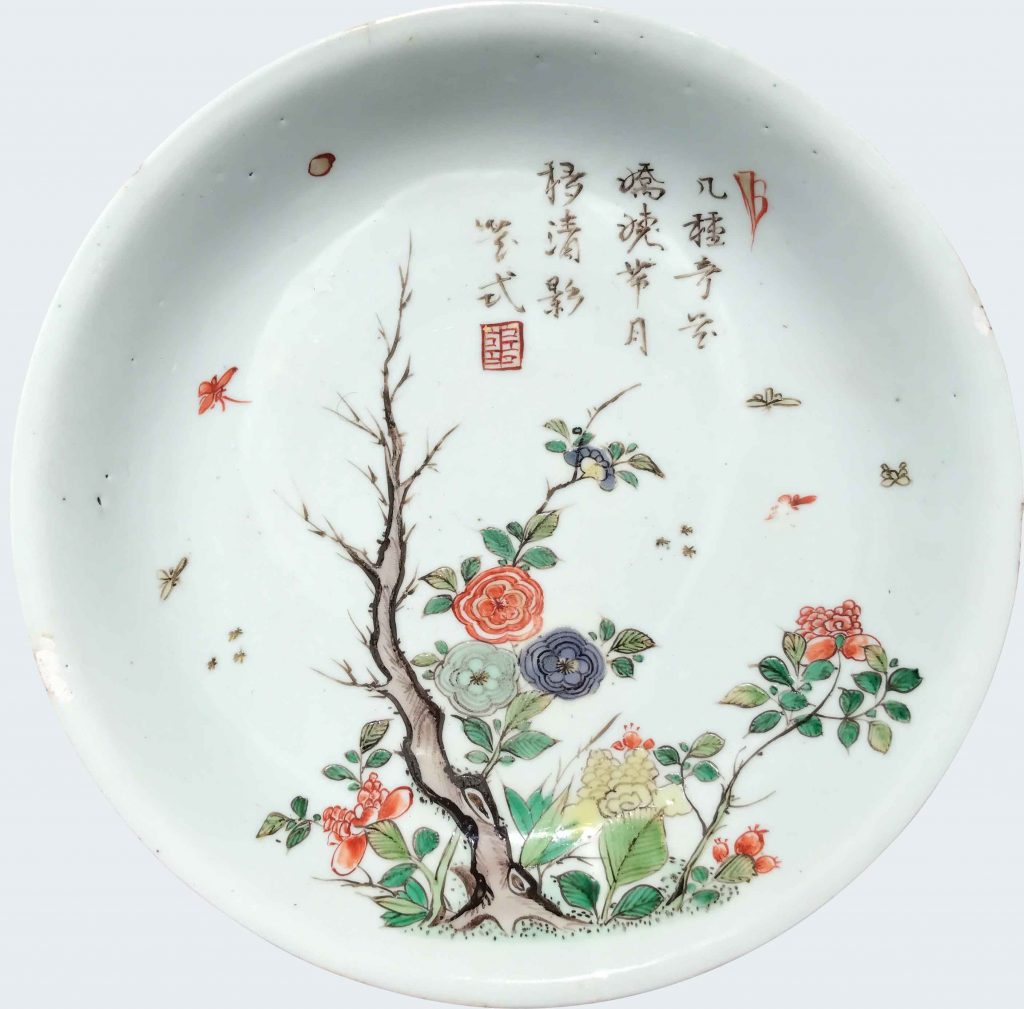 A Chinese famille verte dish decorated with inscriptions and a seal mark. Kangxi period