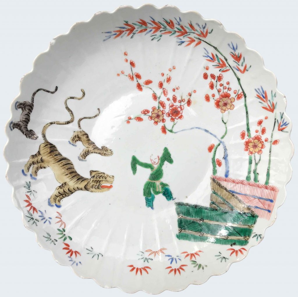 Moulded as a chrysanthemum flower, on a footring, the petal in very low relief. Decorated in enamels with bamboo and blossoming prunus near a zigzagging bamboo fence, a dancing boy and three approaching tigers.