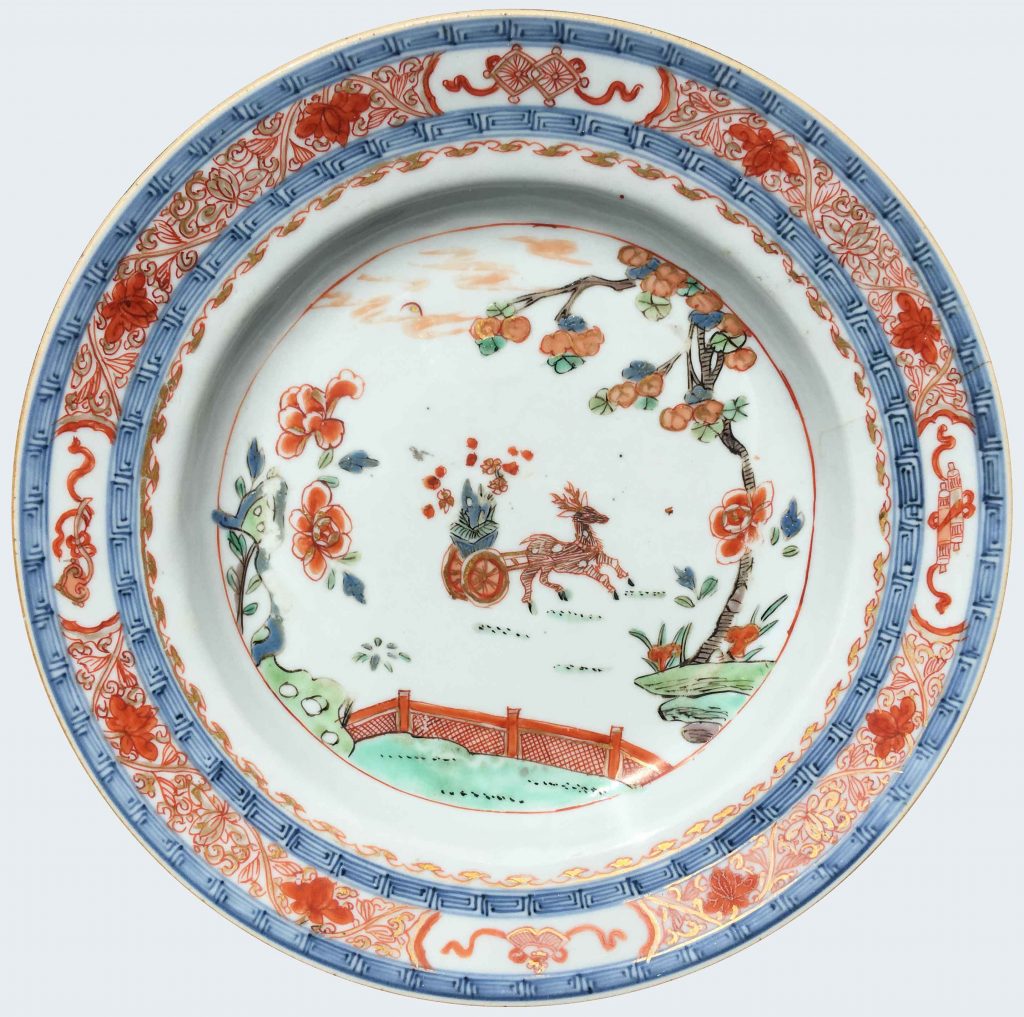 Painted in the famille verte palette and decorated with a deer pulling a cart containing a flowering plant in a vase, in a fenced garden amongst trees, from which lingzhi fungus grows, and ornamental rockwork. The rim of the plate has a finely-drawn iron red and gilt lotus scroll border with precious objects in reserved […]
