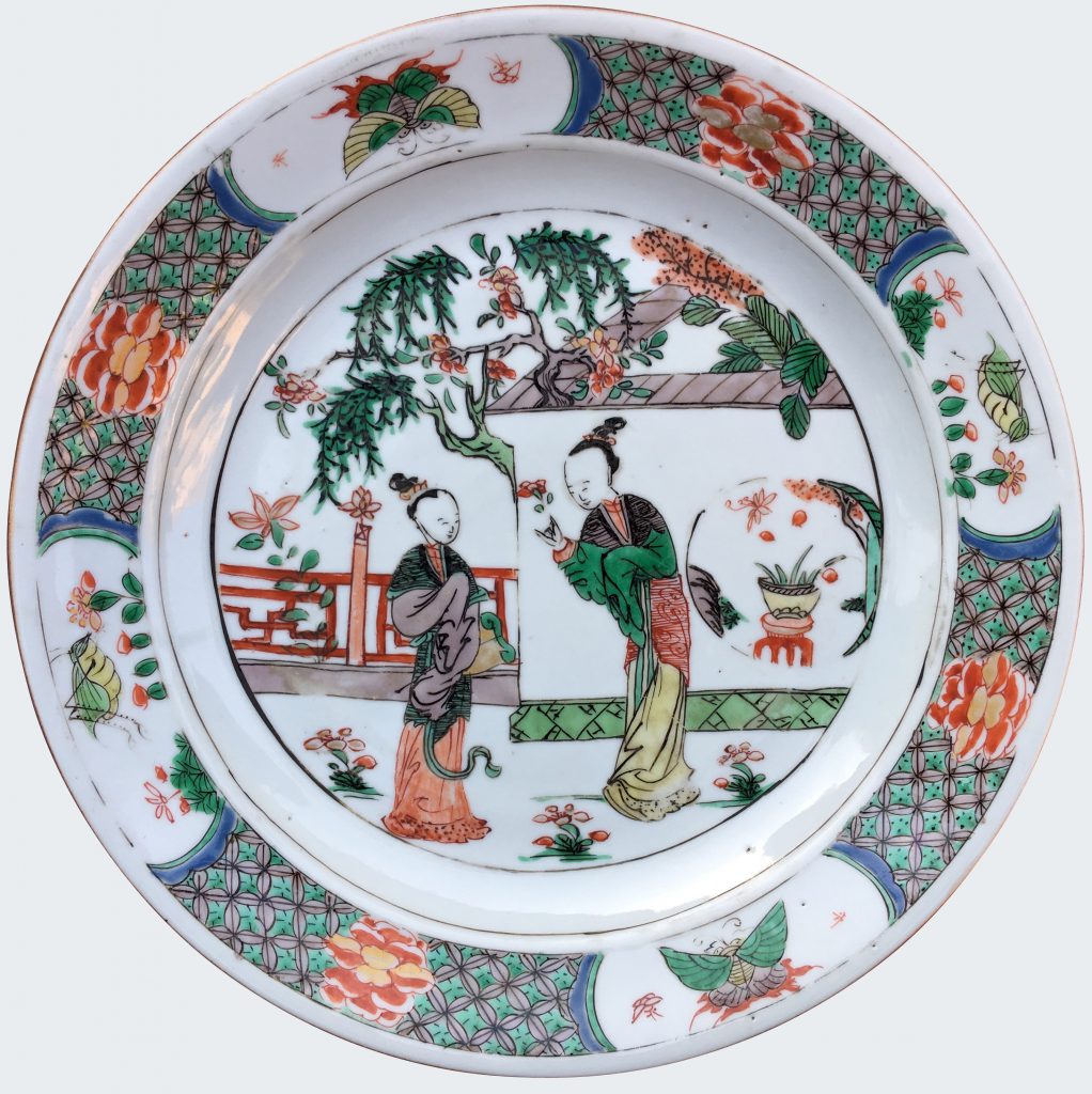Decorated in the famille verte palette, with two ladies in a fenced garden outside a walled enclosure, the rim encircled by a green-ground diaper border decorated with a bright iron-red flowerheads spaced between panels in reserve alternately enclosing butterflies and cicadas.
