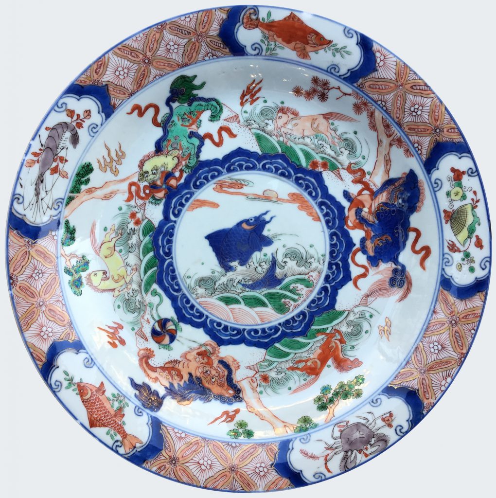 Decorated in the famille verte palette to the interior with three buddhistic lions frolicking on rocky promontories alternating with three horses prancing on stylized circular waves, all encircling a central medallion of a carp leaping from froth-capped waves, the everted rim decorated with shaped panels of various sea creatures reserved against a iron-red and gilt floral […]