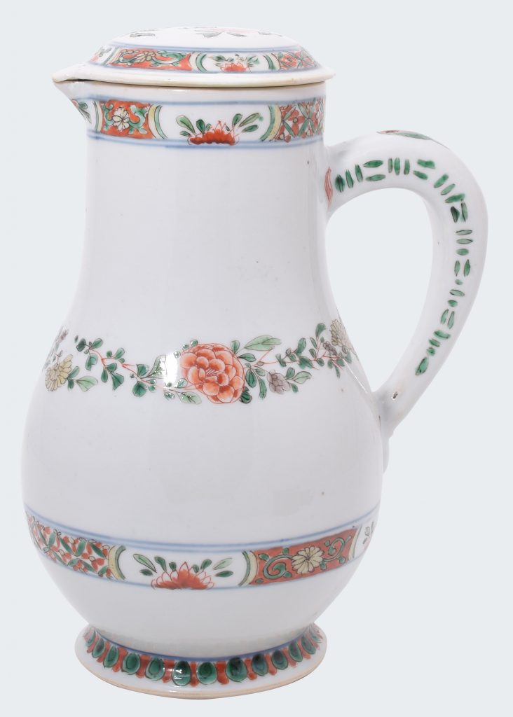 The body of pear form standing on a splayed foot encircled by a petal border in green enamels and rouge-de-fer, the sides encircled by a formal borders and a central horizontal floral frieze, the border around the rim repeated on the low domed cover pierced with a hole corresponding to another on the bold loop […]
