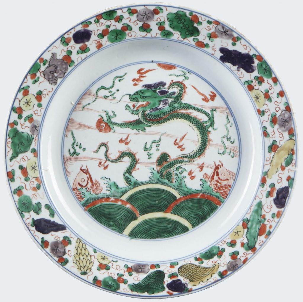 A Chinese famille verte charger decorated with a dragon chasing the flaming pearl. Kangxi period.