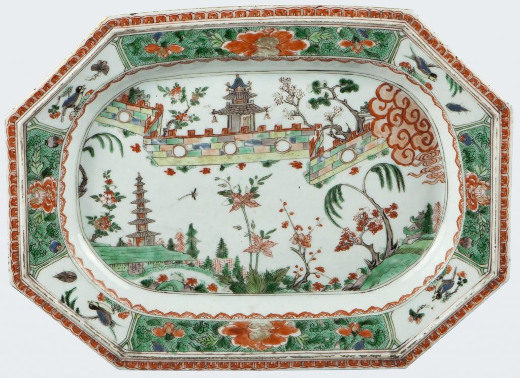 Decorated in the famille verte palette with a crenelated wall and pagodas, within a floral border and moulded gadrooned rim.