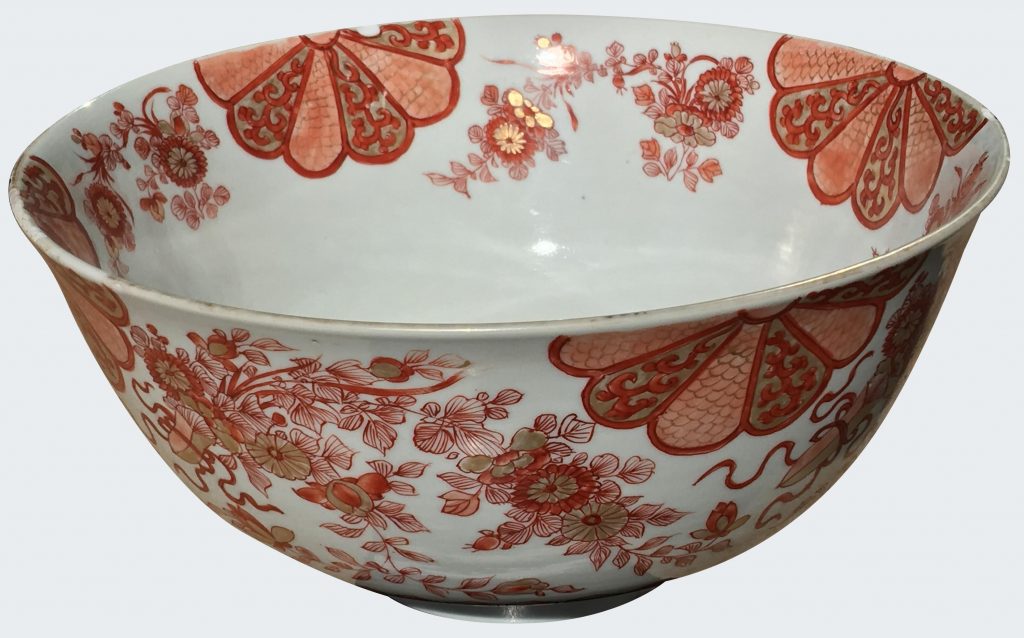 Large blood and milk bowl painted with Buddhist emblems, Buddhist wheels and flowers.
