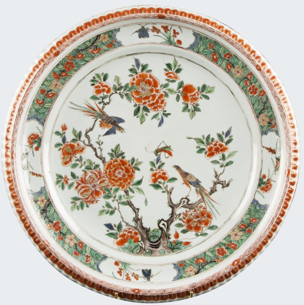 A Chinese famille verte charger decorated with two birds. Kangxi period.