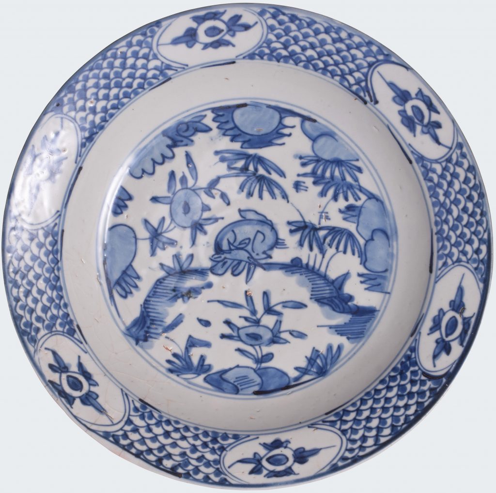 Decorated in underglaze blue, the rim decorated with six alternating floral medallions and fish scale design. At the centre, the decoration depicts the sun, pine trees, rocks, plants and an antelope.