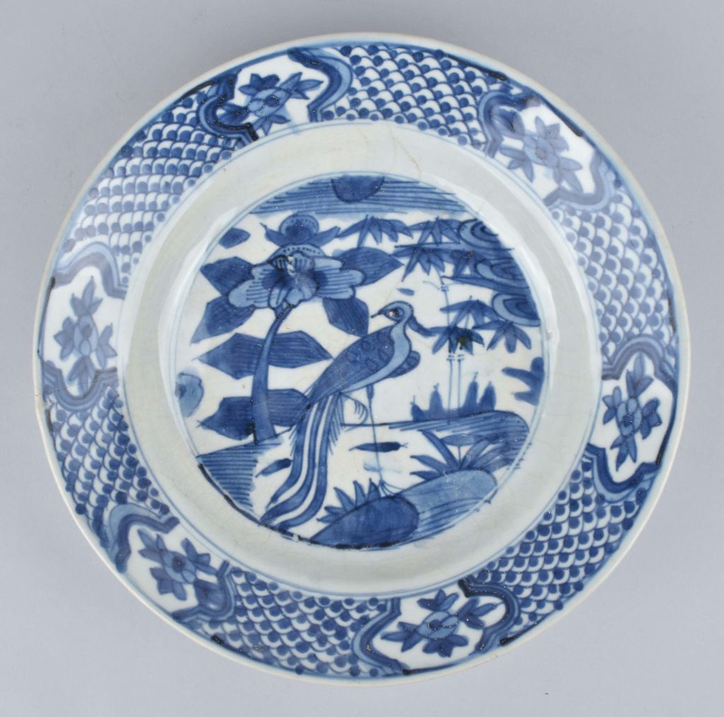 A large Chinese blue and white dish decorated with a peacock for the Asian market (Swatow) – Ming dynasty (ca. 1600)