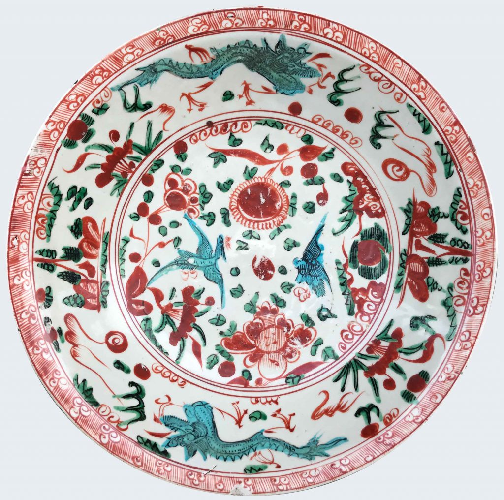 Decorated with green and red enamels with dragons, phoenixes (Fenghuang) and flowers.
