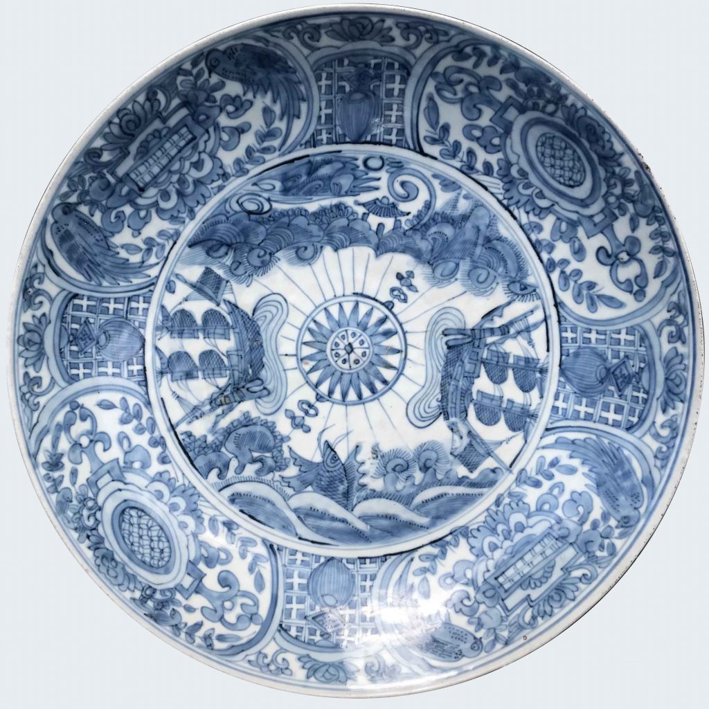 Painted to the centre with a marine rose radiating lines, two large cargo ships under sail on either side, and a giant fish-like sea monster emerging from waves opposite a mountainous landscape with ornamental gates to the foreground, the cavetto with cartouches framing emblematic patterns in opposite pairs, one pair flanked by long tailed birds, […]