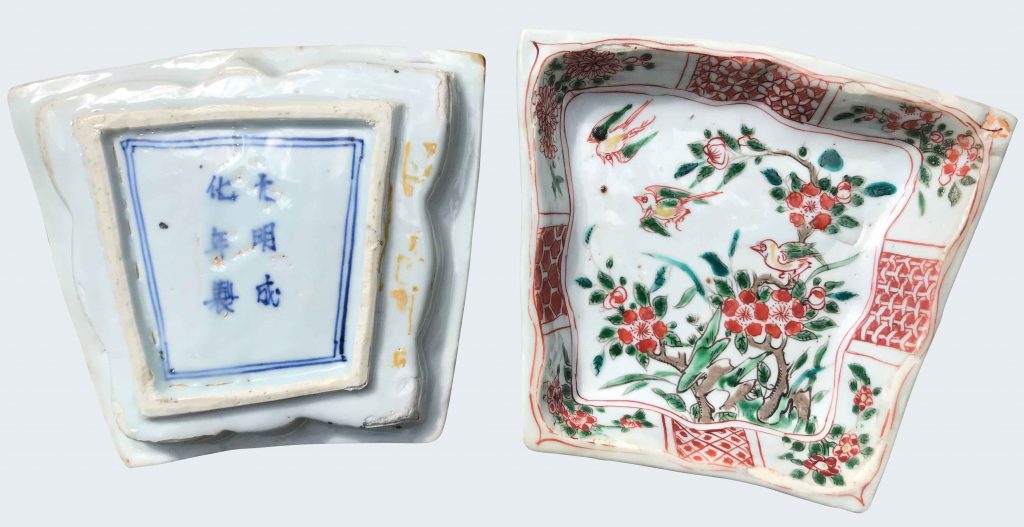 Two Chinese Transitional fan shaped dishes decorated in the famille verte palette with birds. Late Ming – Chongzhen reign – Chenghua six characters mark.