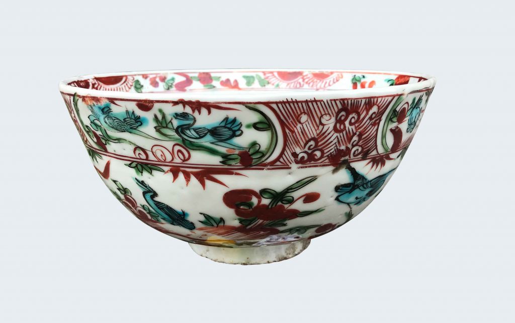 Decorated with green and red enamels with animals and flowers.