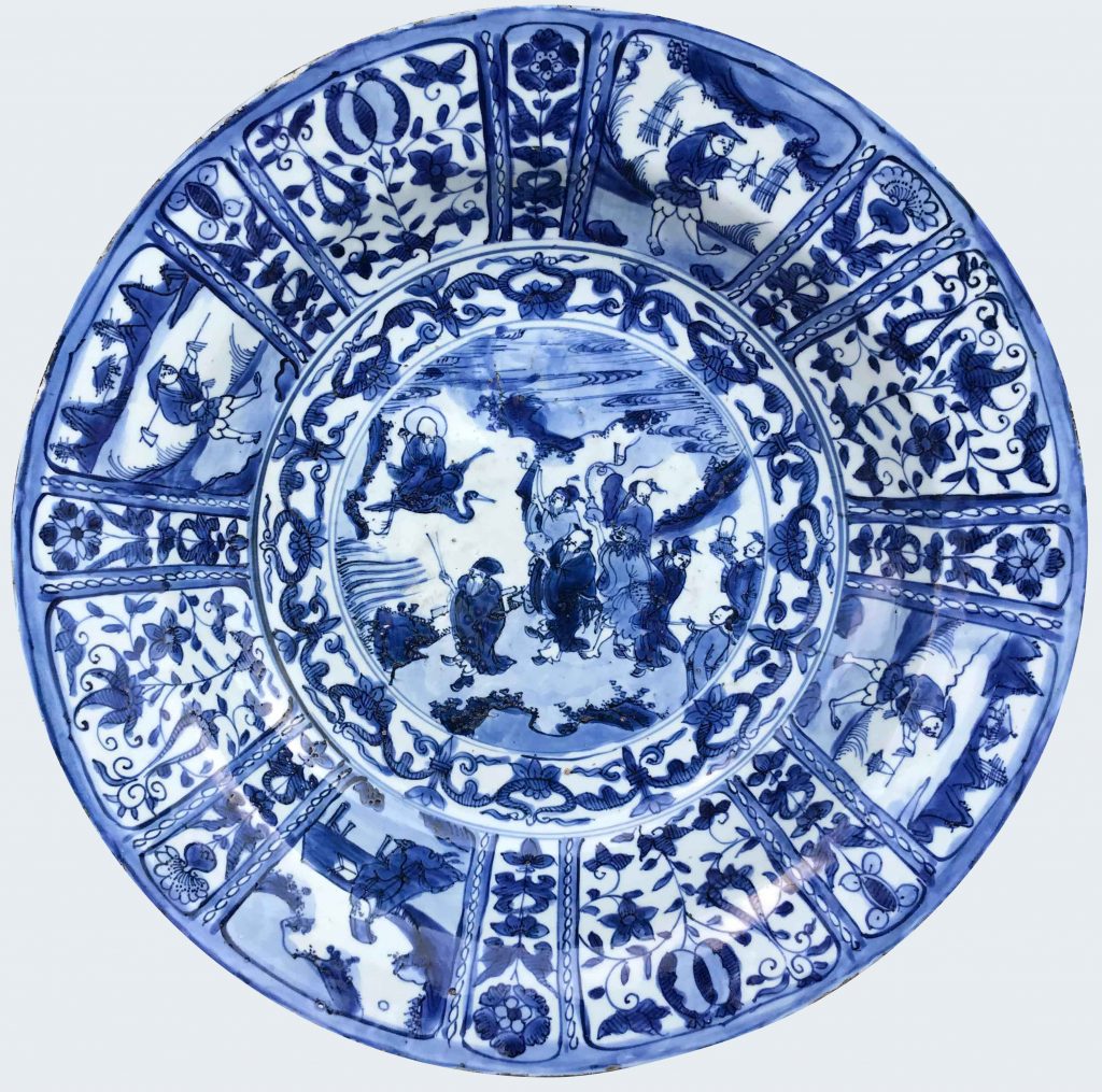 A very large Chinese blue and white charger decorated with the The Eight Daoist Immortals. Transitional period, circa 1635-1650.