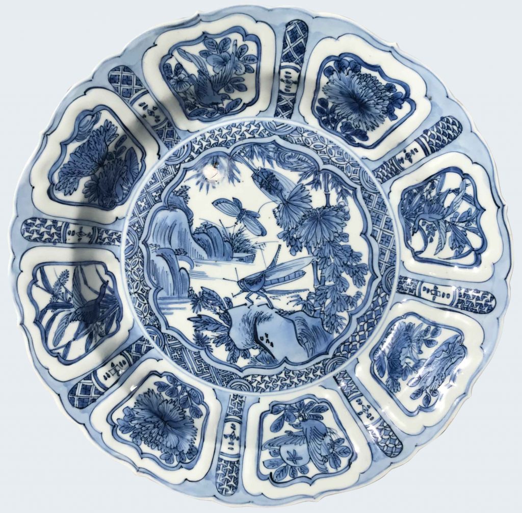 Decorated in underglaze blue and painted to the central star-shaped panel with a grasshopper perched on rockwork beside blossoming flowers and plants, the radiating panels alternating further flowers and precious objects.