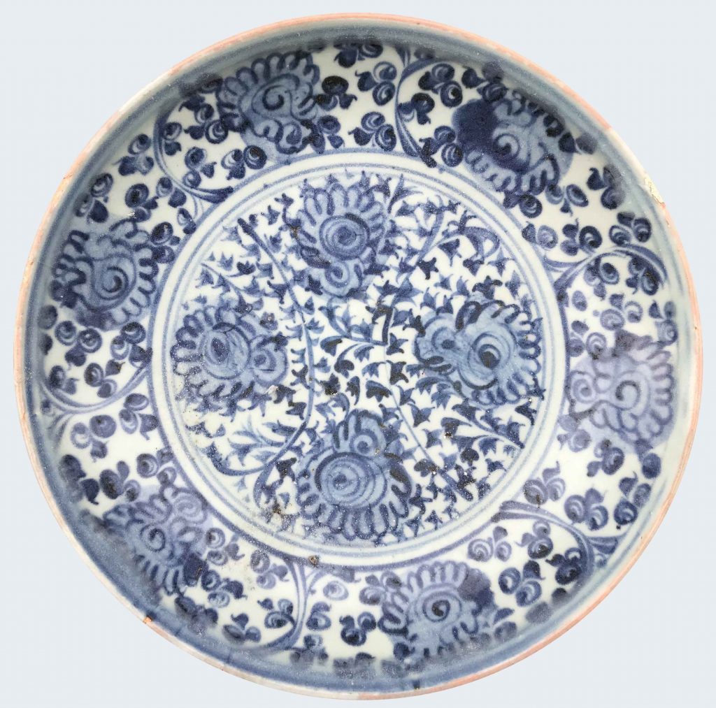 A large Chinese blue and white dish decorated with flowers. Ming dynasty – Hongzhi period