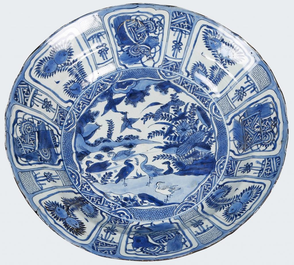 Very large blue & white charger decorated with ducks in a landscape. On the rim, panels with auspicious objects.