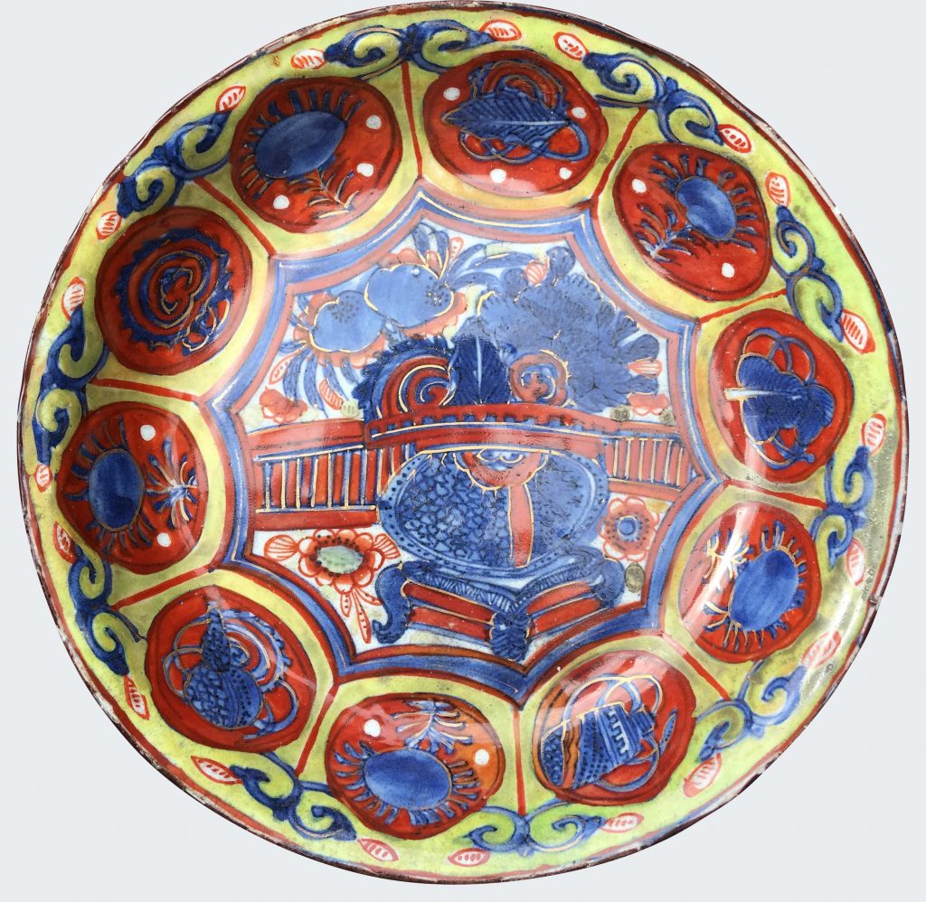 Decorated in the centre with a flower basket, the rim divided in sections. Red and green enamels were probably added in the 18th century in Holland.