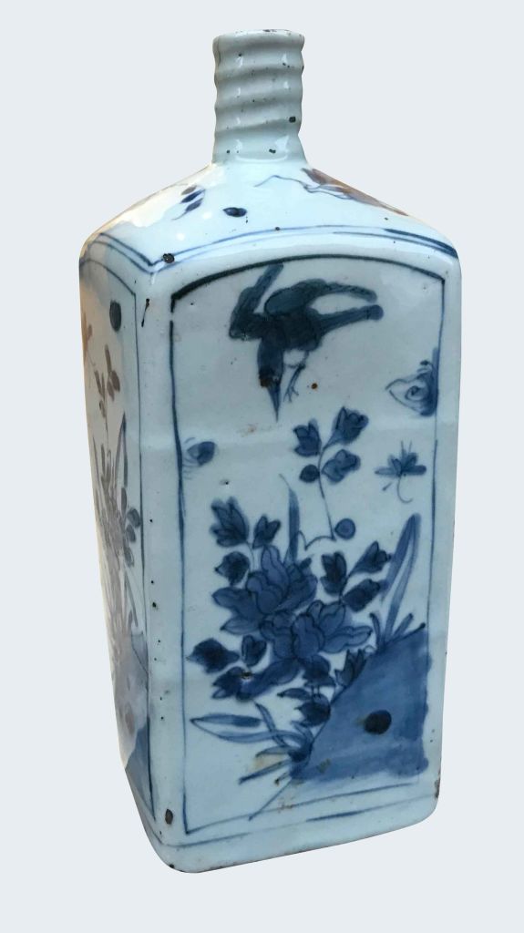 A Chinese blue and white square bottle vase. Late Ming/Transitional period.